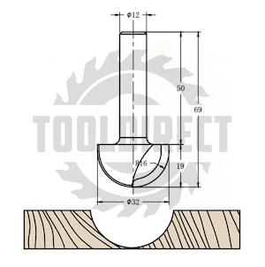 R=16 D=32x19x69 S=12 ROTIS Концевая фреза алмазного типа «Галтель» для станка с ЧПУ для обработки фасада из МДФ TD-051 513212.01