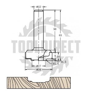 D=34x10x63 S=12 ROTIS Концевая фреза алмазного типа филенка для станков с ЧПУ для работе по фасадам из МДФ TD-081 813412.01